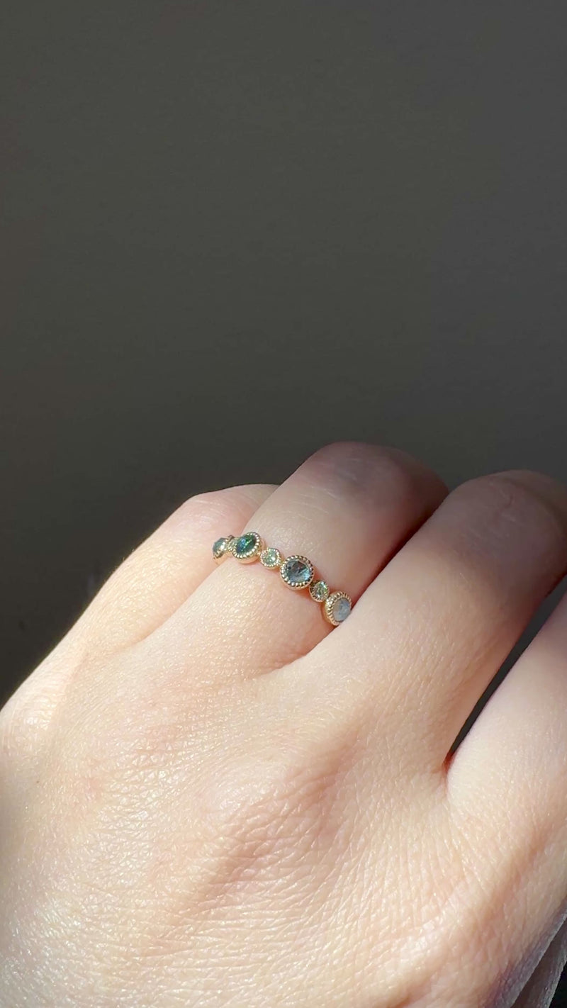 The sapphire’s subtle hues shift between misty blue and fern green, echoing the quiet landscapes of Montana where it was born. Designed to stack beautifully or shine on its own, this piece carries a touch of modern simplicity and timeless grace.